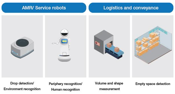 自主機器人不僅被用于工業(yè)應(yīng)用,如工廠和配送倉庫的運輸,還應(yīng)用于公共設(shè)施、醫(yī)院、火車站和商業(yè)綜合體。除了簡單的任務(wù),如運輸,包括手臂應(yīng)該使機器人從事更高級的任務(wù),如組件組裝。在這種多變的環(huán)境中,三維視覺傳感器能夠準(zhǔn)確地檢測周圍環(huán)境,以避開人、障礙物和不平的表面,從而實現(xiàn)機器和設(shè)備的自主操作。然而,傳統(tǒng)應(yīng)用中使用的攝像機和2D激光雷達(dá)的探測范圍有限,需要多個設(shè)備的組合,這就帶來了復(fù)雜結(jié)構(gòu)的挑戰(zhàn)。