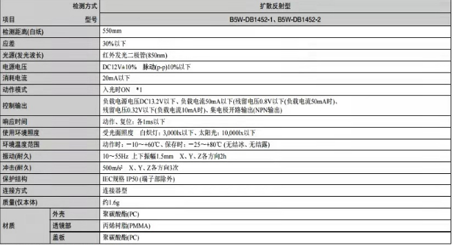 歐姆龍B5W-DB的光源為紅外發(fā)光二極管(850nm),受光面照度在白熾燈的情況下為3,000lx以下、太陽(yáng)光的照度下為10,000lx以下。不僅如此,B5W-DB的外殼采用聚碳酸酯(PC)、透鏡部采用丙烯樹脂(PMMA)、蓋板采用聚碳酸酯(PC)材質(zhì),保護(hù)結(jié)構(gòu)符合IEC規(guī)格IP50標(biāo)準(zhǔn)(端子部除外),可幫助設(shè)備實(shí)現(xiàn)強(qiáng)耐用性。