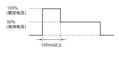 其中保持電壓需要注意的點(diǎn)是繼電器動作后將線圈電壓降低至保持電壓使用時(shí),請如下圖所示,首先對線圈施加額定電壓100ms以上,且線圈保持電壓需為額定電壓的50%以上,避免因線圈電壓變動等爾低于該值。